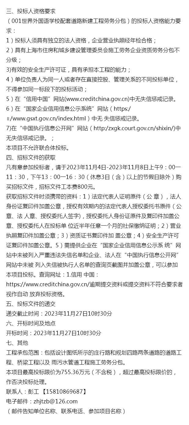 (001)世界外国语学校配套道路新建工程劳务分包;